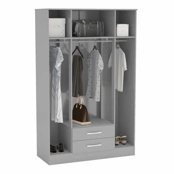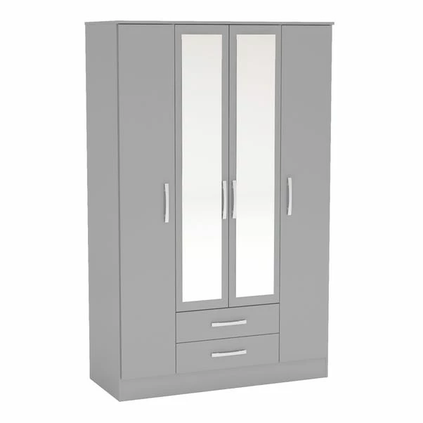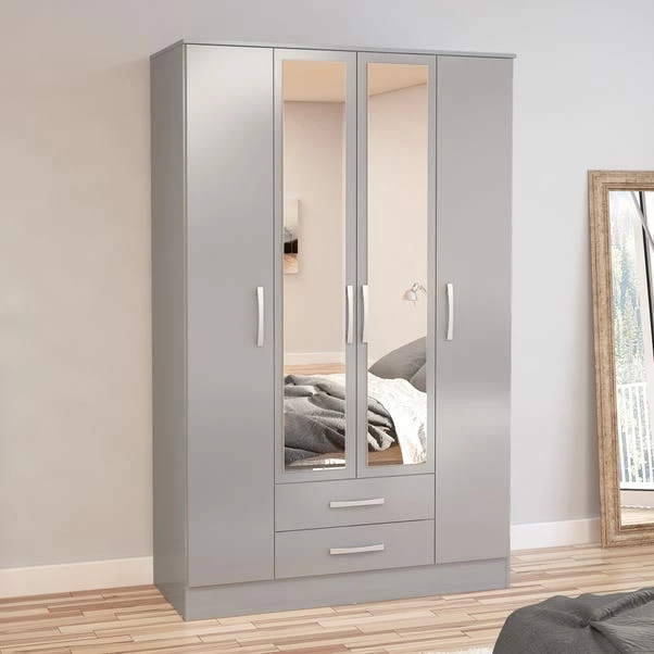 Modern and sleek, the Lynx four door wardrobe with mirror combines a high-gloss finish with bold silver detailing to make any space feel contemporary. Constructed from MDP, this high-quality wardrobe is incredibly sturdy and features a large top shelf as well as 2 smaller shelves that make it easy to keep your space organised. Complete with a sturdy wide hanging rail and 2 spacious drawers to provide plenty of useful storage space.