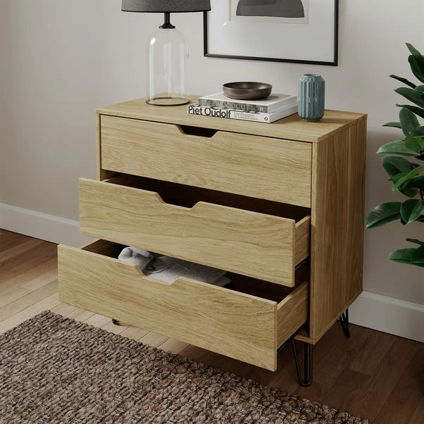 The Bella 3 Drawer Chest Oak Effect has it all, from the classic hairpin leg design to 3 spacious drawers and an oak effect finish, this is a beautiful addition to your bedroom and will look great with any colour scheme.