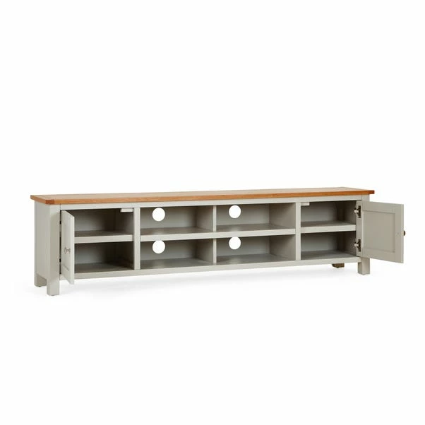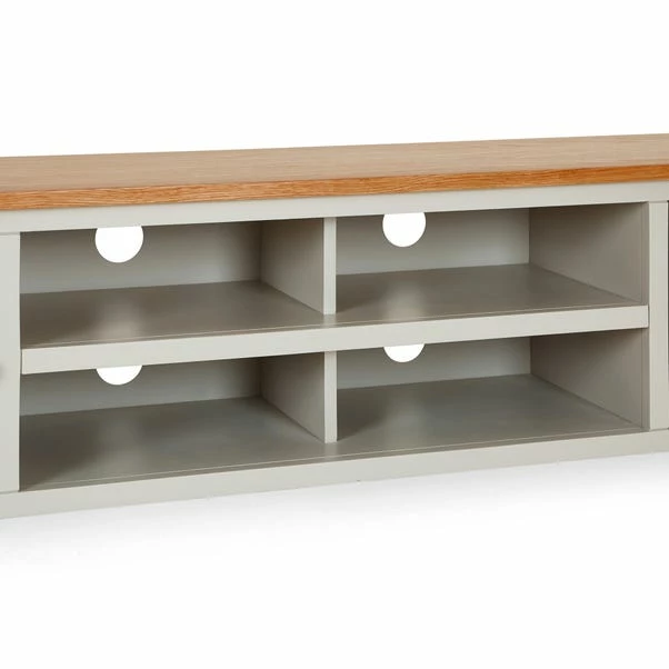 Perfect for keeping your consoles and media collections organised, the Bromley Extra Wide TV unit comes complete with four open shelf spaces, each with a convenient cable aperture, and two ample sized cupboards.