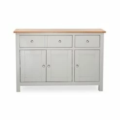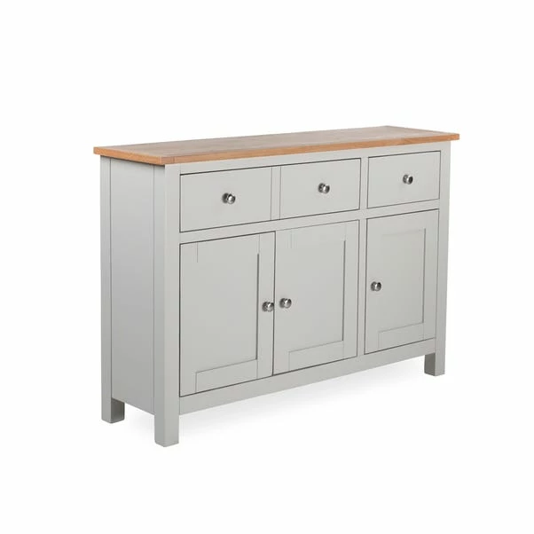 Designed to maximise storage space, this fully assembled sideboard features one wide drawer and a small drawer, complete with round metal handles. This sideboard is crafted with one wide cupboard, complete with three doors and a fixed shelf inside for convenience.