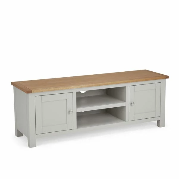 This wide Bromley TV unit comes complete with a fixed shelf, two ample sized cupboards and cable access, perfect for storing away household items and keeping cables neat and tidy.