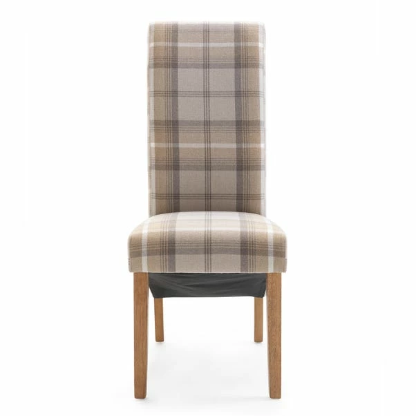 The Chester set of two dining chairs feature a timeless design complete with scrolled back detail, deep skirt and tapered solid wood legs in an oak finish. Easily assembled, the foam filled, webbed and sprung seats provide luxurious comfort while the high back offers plenty of support. Upholstered in a natural woven check fabric, these dining chairs can be matched to our bestselling Oswald occasional range to create a dramatic look in any combined living dining space.