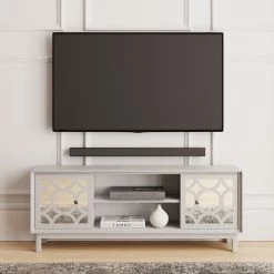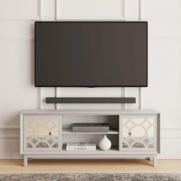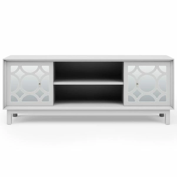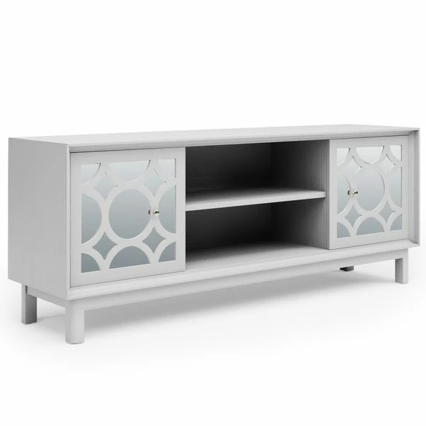Crafted with solid wood legs, wooden runners and elegant metal handles, the stylish Delphi tv unit features two open shelves with cable holes and two stylish mirrored doors.