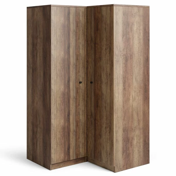 The Fulton Corner Wardrobe is a practical and stylish addition to any bedroom, with a rustic pine finish and black metal hardware creating an industrial look. Offering plenty of useful storage space, this Fulton wardrobe comes complete with a hanging rail and 5 spacious shelves for all your storage needs.
