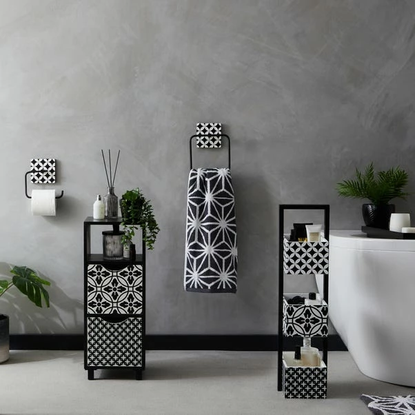 Boasting a stunning geo tile design, this free standing storage caddy is ideal for keeping all your bathroom essentials neat and tidy. In a compact design, this caddy saves space whilst also providing you with ample storage space. Other matching bathroom accessories are also available.