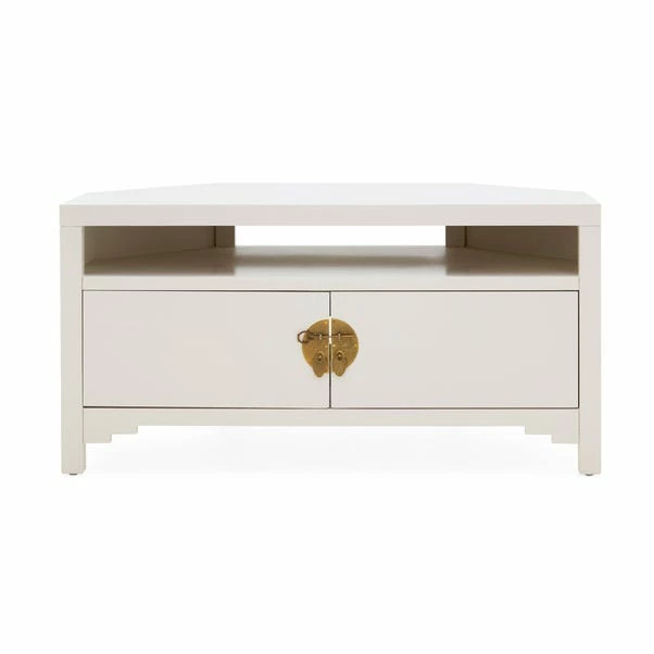 Elegantly crafted, this corner TV stand is the perfect addition to your living space. Complete with two beautifully designed doors with ample storage space and finished with attractive antique metal handles, this stunning TV stand would suit a range of interiors.