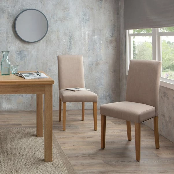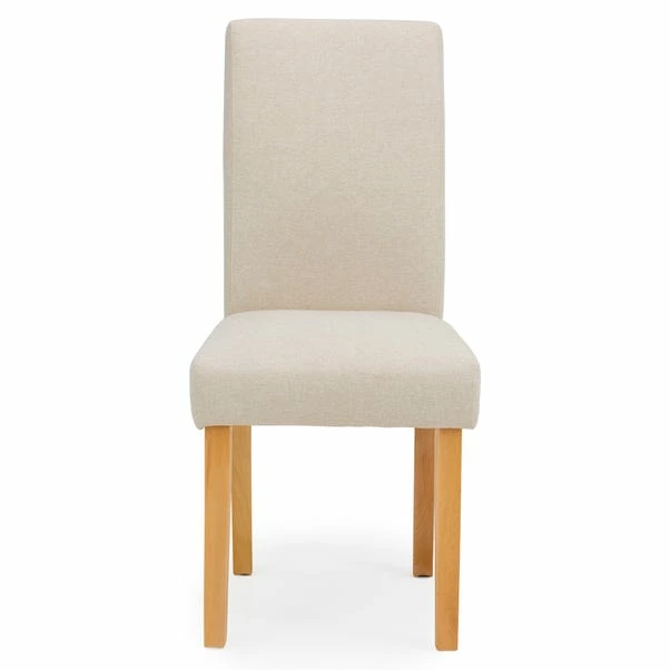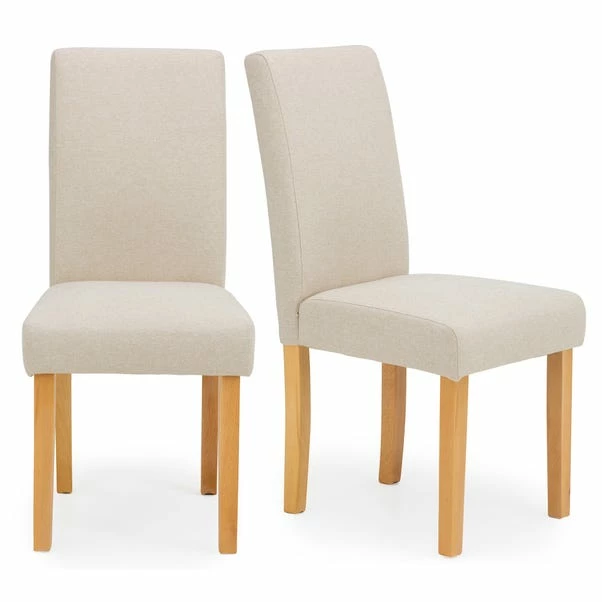 Upholstered in a cream coloured flatweave fabric, the contemporary Hugo set of 2 dining chairs suit a variety of styles and would be a great addition to any dining space. Complete with foam-filled seats and backrests, these easily assembled dining chairs are designed to provide plenty of comfort and feature tapered, oak finished solid wood legs to match a range of furniture.