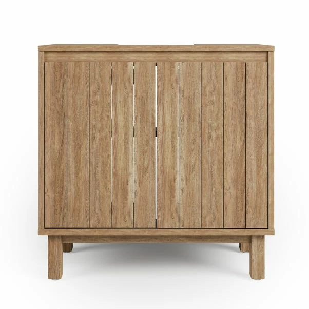 This mango wood effect undersink unit fits snugly under your existing sink, making it a smart space saving solution to store all your bathroom essentials and toiletries out of sight for a clutter-free space. With a slatted wood effect finish with 2 doors and 2 shelves, this unit is both stylish and practical.