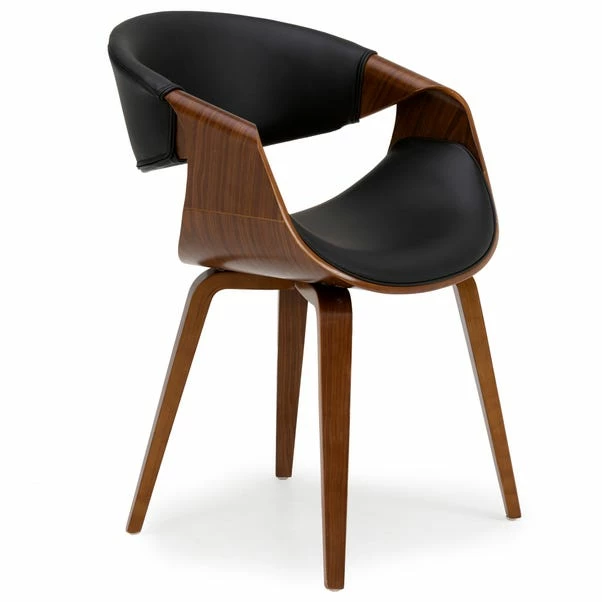 With its modern, retro inspired design, the Modena chair features a foam-filled, black faux leather seat and backrest, complemented by a varnished beech wood finish. This easily assembled chair features a stylish folded backrest providing a unique look, and comes complete with sturdy, Scandi style legs. A versatile design, this chair would work well in a variety of living spaces.