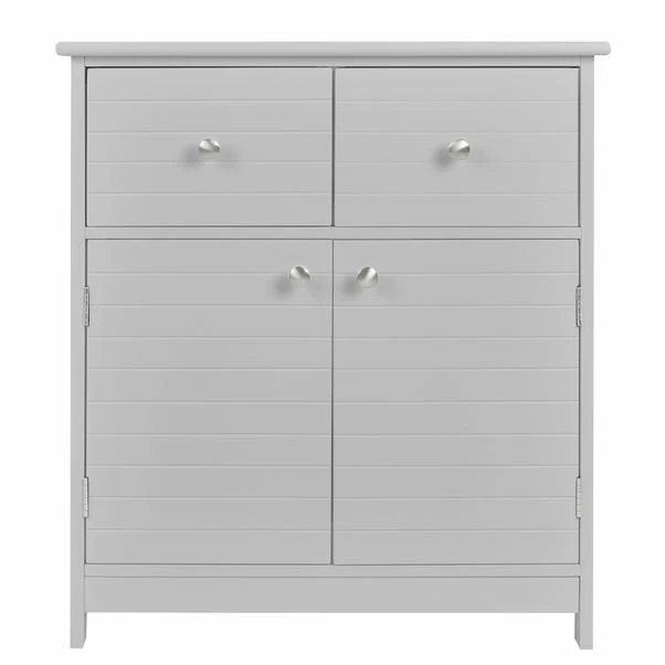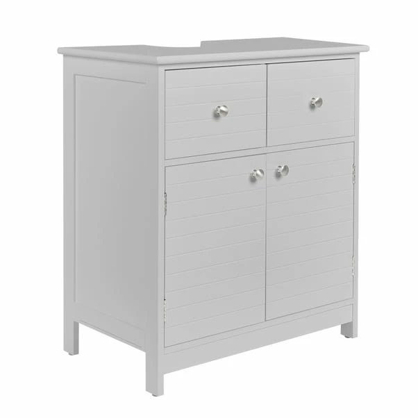 Maximize your bathroom storage with this useful under sink storage. With a grey water-resistant painted finish and nickel handles, this sink unit is stylish and timeless. This unit includes 2 drawers plus 2 doors with shelves to store all your bathroom essentials out of sight.