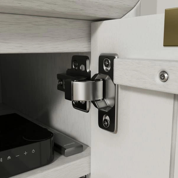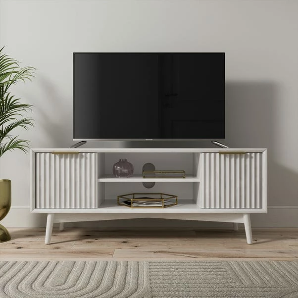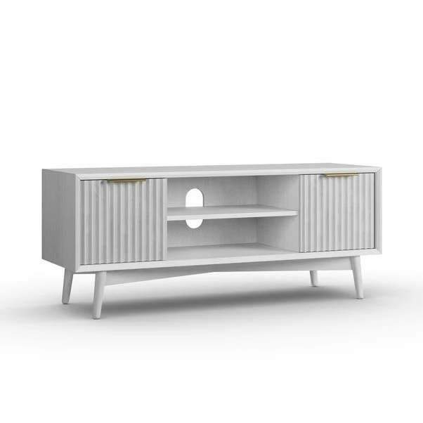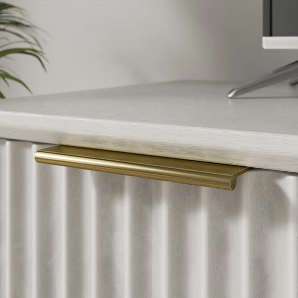 Add a little pizzazz to your living space with this fun and casual TV unit. Featuring a washed white painted finish and champagne metal handles, it’s sure to make a statement in any room. Not only is it aesthetically pleasing, but its fluted front design, open shelves, and hole for cable management make it highly functional too. Whether you’re setting up the perfect entertainment centre or just need a little extra storage space, this TV bench is sure to be the talk of the town!