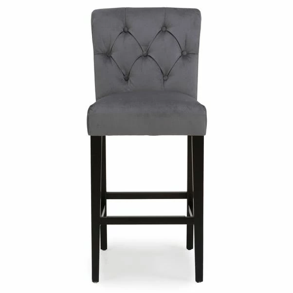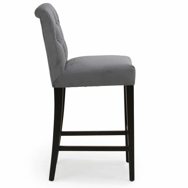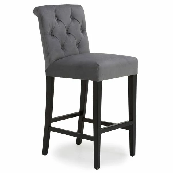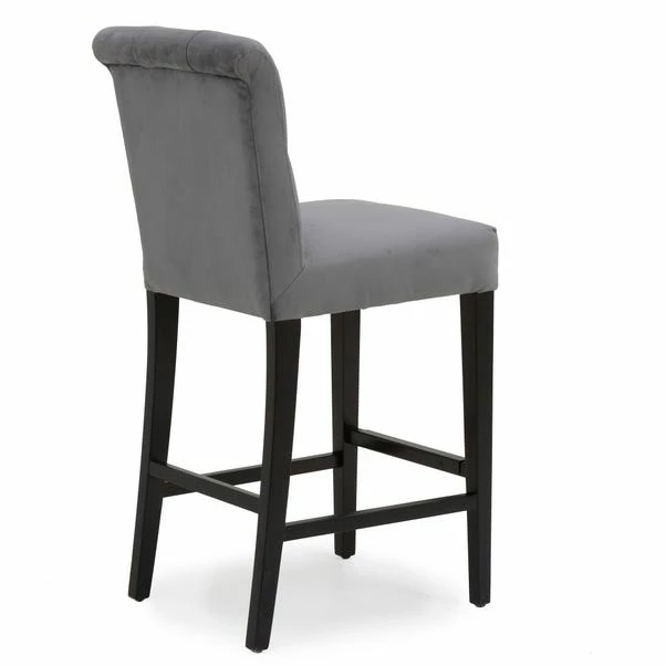 Boasting a luxurious style, the elegant Newbury velvet bar stool is upholstered in a stylish grey velvet fabric, with a classic button back detail and contrasting black painted solid pine legs. This fully assembled bar stool, the perfect height to suit standard UK counter tops, offers a comfortable sit thanks to its foam-filled, sprung and webbed seat complete with a crossbar footrest.
