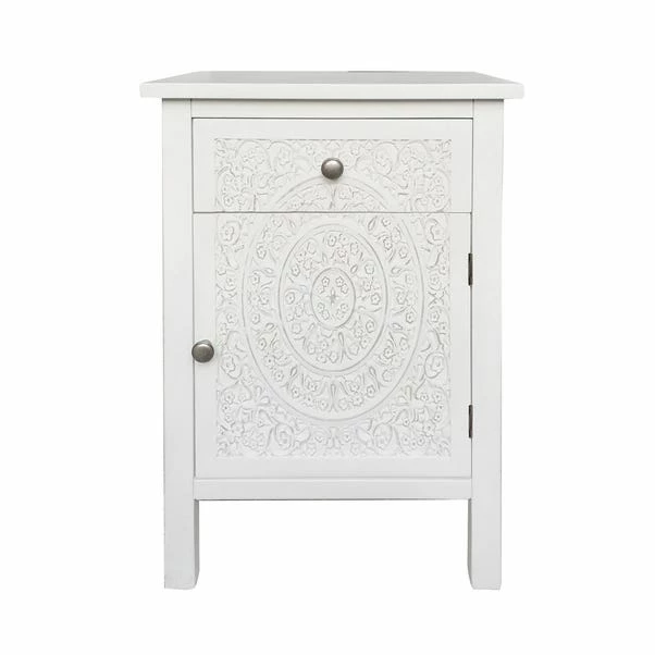 Elegantly designed with a detailed carved out pattern front, the Samira range features a simple yet clean, structured finish. A contemporary style, the Samira range boasts a chunky, wooden design along with beautifully finished metal handles and a natural lacquered paint surface.