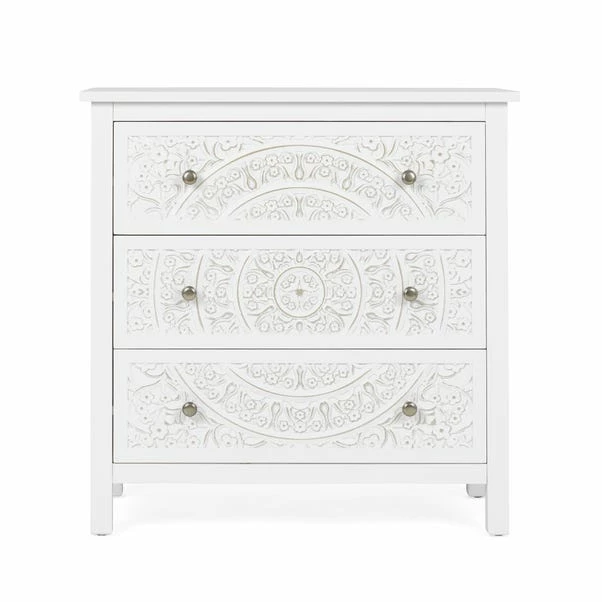 The Samira chest of drawers features three spacious drawers perfect for adding a decorative touch to your bedroom.