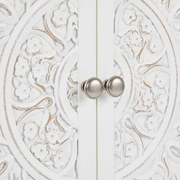 Elegantly designed with a detailed carved out pattern front, the Samira range features a simple yet clean, structured finish. A contemporary style, the Samira range boasts a chunky, wooden design along with beautifully finished metal handles and a natural lacquered paint surface.