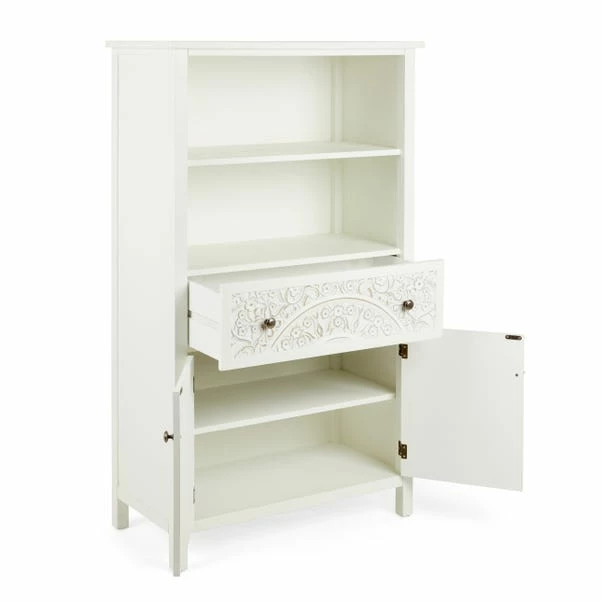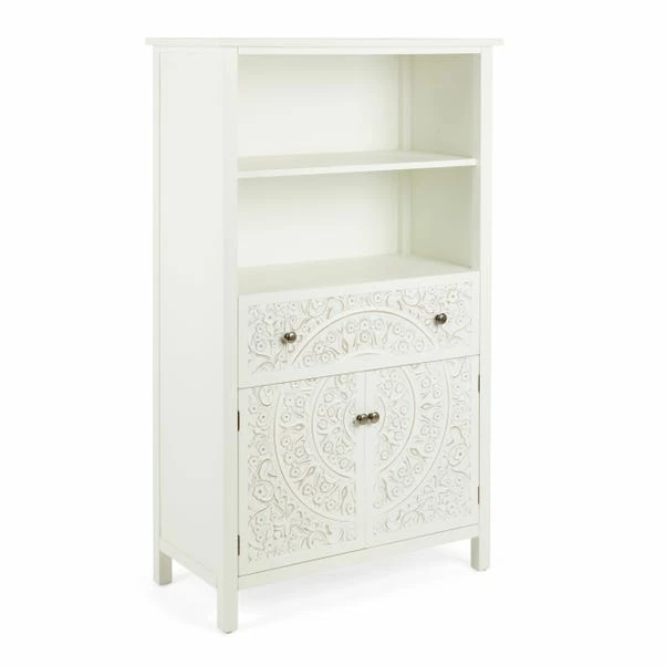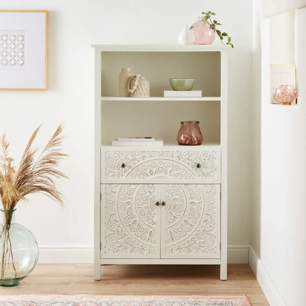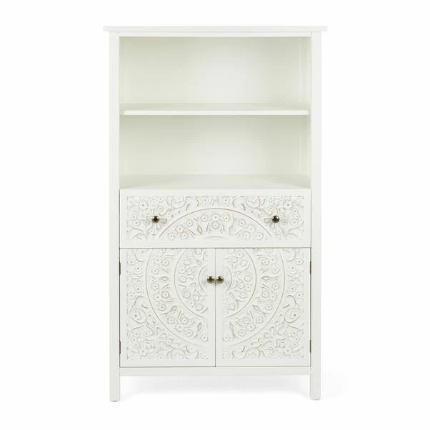 This elegantly designed Samira White Tall Cabinet features a delicately detailed, carved out pattern front. This wooden carved design is brought out with the stylish paint finish, which complements the beautifully finished brushed metal handles. Finished in a timeless white colourway, the Samira Tall Cabinet features a spacious cupboard with fixed shelves and a drawer, providing an ample amount of storage space.