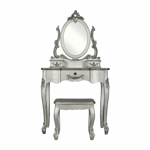 Complete with a stylish matching stool, this dressing table set features ample drawer space, with one central drawer and two smaller drawers below the mirror. Deigned with an oval, ornate, adjustable mirror, the Toulouse dressing table set is finished with a solid pine frame and legs for durability.