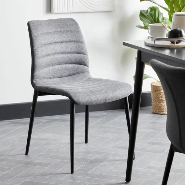 Featuring a modern design, this stylish dining chair features sturdy powder coated black metal legs paired with a stunning curved back seat. Upholstered in a stylish fabric upholstery and complete with gorgeous vertical ribbed stitch detailing. This dining chair feature deep foam padded seats for maximum comfort and support, perfect for any kitchen dining space.
