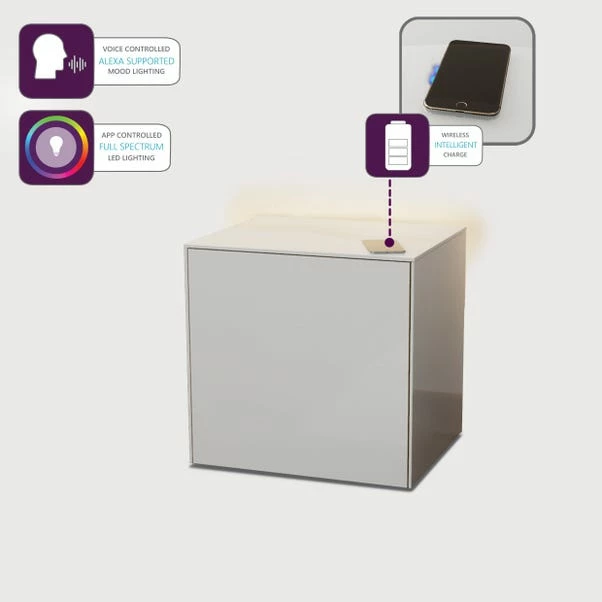 Upgrade your lamp table the smart way – this Intel LED Lamp Table is sure to wow you with its futuristic features. The full colour spectrum LED mood back lighting that can be operated by the free Frank Olsen app or voice control via Amazon Alexa, so you can change the vibe at the touch of your finger or at your order. Charge your phone without the messy wires and faff thanks to the table’s wireless phone charging compatibility, simply pop your phone on the table to charge! This contemporary table has a high gloss finish with matching glass top for easy cleaning, with an internal shelf to store all your bits and bobs.