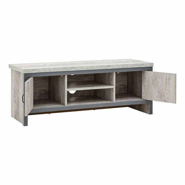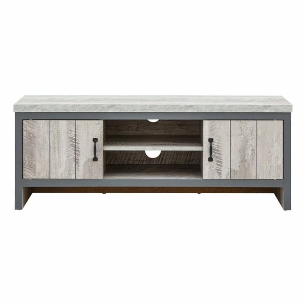 Boasting a bold industrial-chic design, the Boston TV Stand is perfect for brining a contemporary design statement to your living space. This modern unit boasts a chunky construction and features two open shelves for media devices with wide cable apertures as well as two spacious cupboards with magnetic catches. The industrial look is accentuated by the distressed grey finish with contrasting black metal handles and dark grey wooden frame.