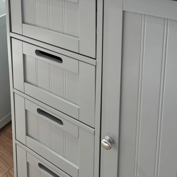 An elegant yet functional addition to your home, this self-assembly bathroom storage unit is ideal for keeping your home tidy and organised. With a contemporary white finish this solid pine storage unit will give you plenty of room to store away bathroom essentials with four large drawers, and a cupboard with a storage shelf inside. It will look good in any home with its simple style and is both functional and durable, made with a solid construction.