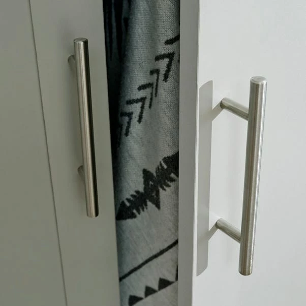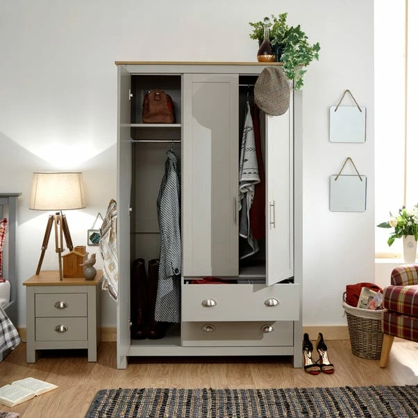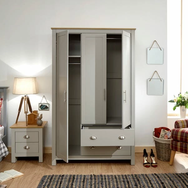 The Lancaster Triple Wardrobe boasts a stylish shaker-inspired design that’s perfect for kitting out a bedroom in first-class style. The sleek lines, soft grey or cream foiled finish with oak-effect tops and brushed steel handles create a sophisticated impression. The wardrobe provides effective storage with a good mix of hanging, drawer and shelf space – Ideal for a room where understated elegance is the goal.