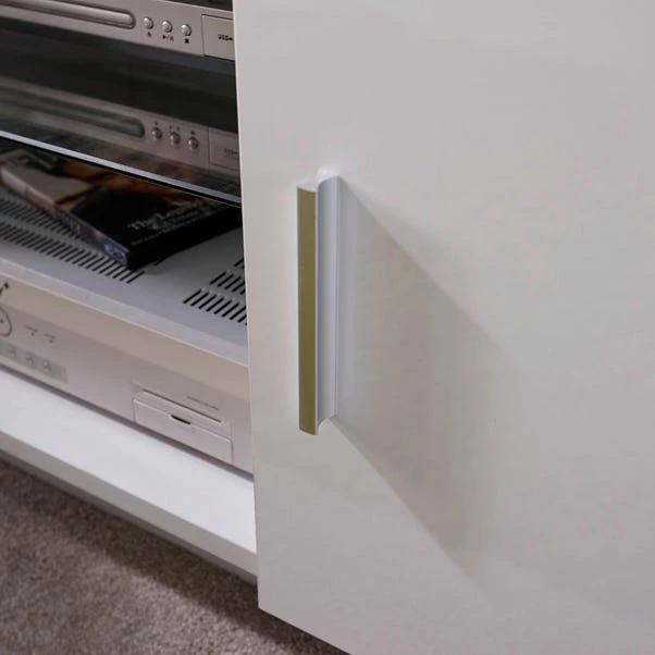 The Lima High Gloss TV Stand features two cupboards with shelves which are ideal for storing DVDs or console games. It also features an open shelf in the middle made from tempered glass that is perfect for holding your AV equipment.