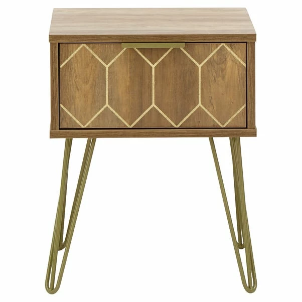 Add a touch of understated glamour to your living space with the retro-inspired Orleans Side Table. The simple mango-effect construction creates a warm, neutral palette that’s enhanced by delicate engraved metallic detail in a modern geometric design. This stunning side table features a slender, yet spacious drawer, complete with neat gold-coloured drawer pulls that perfectly complement the elegant hairpin legs.
