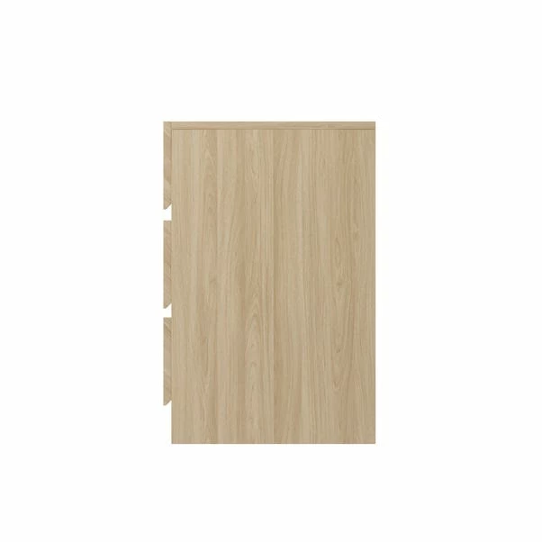 A must-have in any bedroom, this stylish bedside table is a must-have. Its sleek herringbone design is accented with a warm oak wood effect finish while its minimalist handles offer a modern twist. Finished with metal runners, this 3 drawer bedside table is ideal for housing linens, books and more.