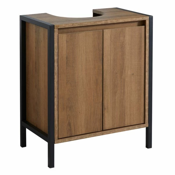 Boasting an oak effect and black metal frame this under sink unit gives your bathroom a ultra modern finish whilst also providing your bathroom with ample storage space. This unit includes 2 internal shelves that are ideal for organising all your bathroom toiletries. With a sleek handle-free design this under sink unit fits snuggly under most standard sinks.
