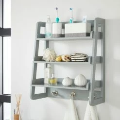 Boasting a clean, crisp painted finish, this shelving unit is perfect for storing and showcasing all your bathroom essentials. With a timeless design, that would compliment any bathroom interior, you can style these shelves however you like. With stylish chrome hooks and three shelves in a ladder formation, this shelving unit provides you with ample storage space. This unit is easy to assemble and is also available in white.