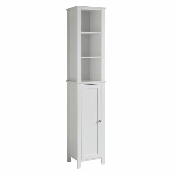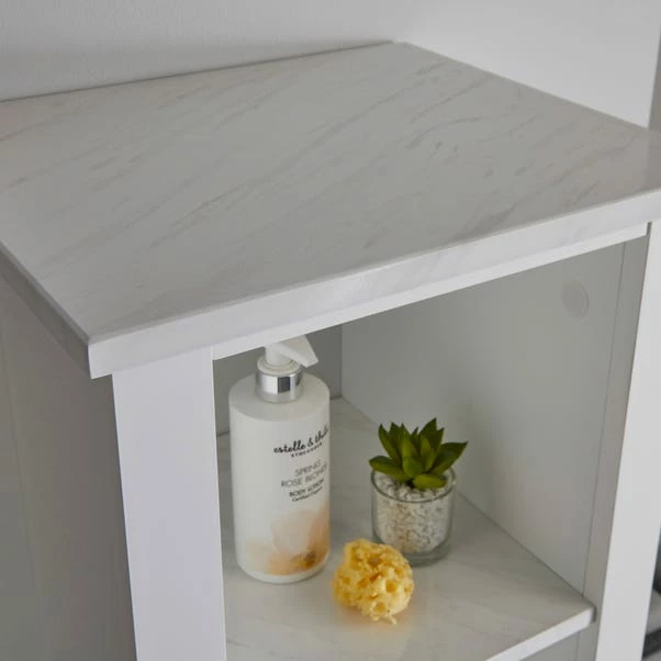 Featuring a contemporary marble effect with chrome handle to finish, this Tall Cabinet looks sleek and stylish, perfect for your bathroom space. It boasts 3 open shelves and 2 interior shelves, offering ample storage space for your home. Coordinate with our other marble bathroom storage units and accessories to complete the look. This range is exclusive to Dunelm.