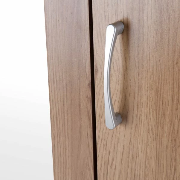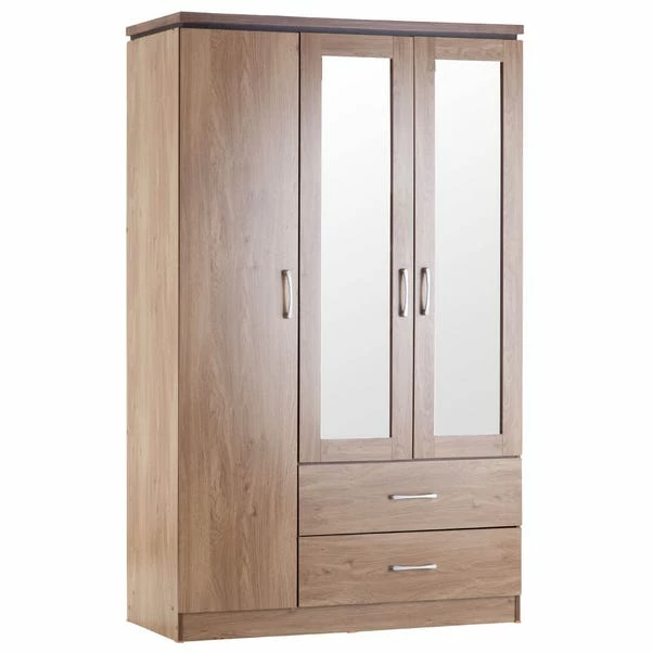 Simple yet stylish, the Charles Triple Mirrored Wardrobe features 2 spacious cupboards, 2 drawers and a handy mirror, making it a great functional piece for any bedroom. This sturdy wardrobe is available in a choice of glossy and natural oak veneer finishes with contrasting silver coloured handles. The cupboard features two hanging spaces, and two spacious drawers.
